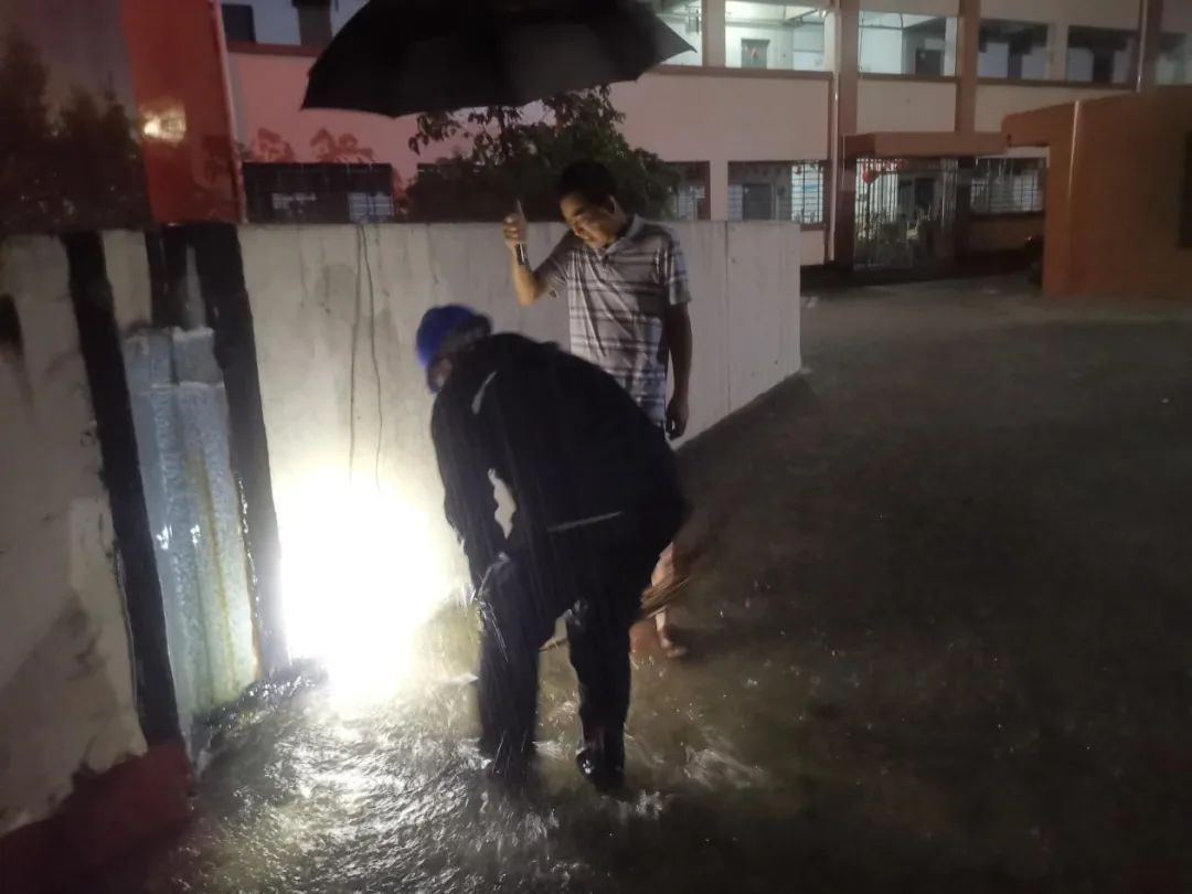 商光美副校长一行深入则徐园、日新园、向高园等片区学生宿舍以及校园门岗、教学实训室、山体边坡、建筑工地等重点区域和重点部位,实地察看抽水设备、防洪沙袋等物资的储备和使用情况,重点对学生宿舍区和户外排水系统、用水用电设施、在建工地施工围挡等可能存在的安全隐患点进行检查,落实落细防汛防台各项措施。