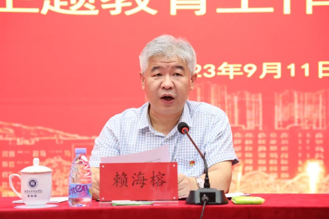 赖海榕书记对学校主题教育工作作全面总结,并就巩固拓展主题教育成果、推动学校事业发展提出要求。他指出,在省委主题教育第15巡回指导组的精心指导下,校党委牢牢把握“学思想、强党性、重实践、建新功”总要求,紧紧锚定“凝心铸魂筑牢根本、锤炼品格强化忠诚、实干担当促进发展、践行宗旨为民造福、廉洁奉公树立新风”目标,坚持学思用贯通、知信行统一,把习近平新时代中国特色社会主义思想转化为坚定理想、锤炼党性和指导实践、推动工作的强大力量,持续推进主题教育走深走实、见行见效。他从坚持以学为先学思践悟、实现理论学习有收获,坚持求真务实实事求是、实现调查研究有成果,坚持刀刃向内动真碰硬、实现检视整改有方向,坚持攻坚克难勇挑重任、实现推动发展有进展等四个方面总结了学校主题教育取得的主要成效,并从必须筑牢思想根基、必须站稳人民立场、必须增强问题意识、必须注重调查研究、必须推动高质量发展等五个方面提炼了学校在开展主题教育过程中形成的宝贵经验。他强调,要全面学习贯彻习近平总书记关于主题教育的重要讲话和重要指示批示精神,建立健全理论学习、调查研究、推动高质量发展、密切联系群众、防止形式主义和官僚主义等长效机制,教育引导党员、干部在以学铸魂、以学增智、以学正风、以学促干上下功夫见实效,在强党建促发展、破难题开新局、办实事暖民心、抓改革建新功上见行动出实招,在改进提高、增效提质、深化提优上出举措用实劲,奋力推进学校事业高质量发展,加快建设特色鲜明的高水平技术师范院校。