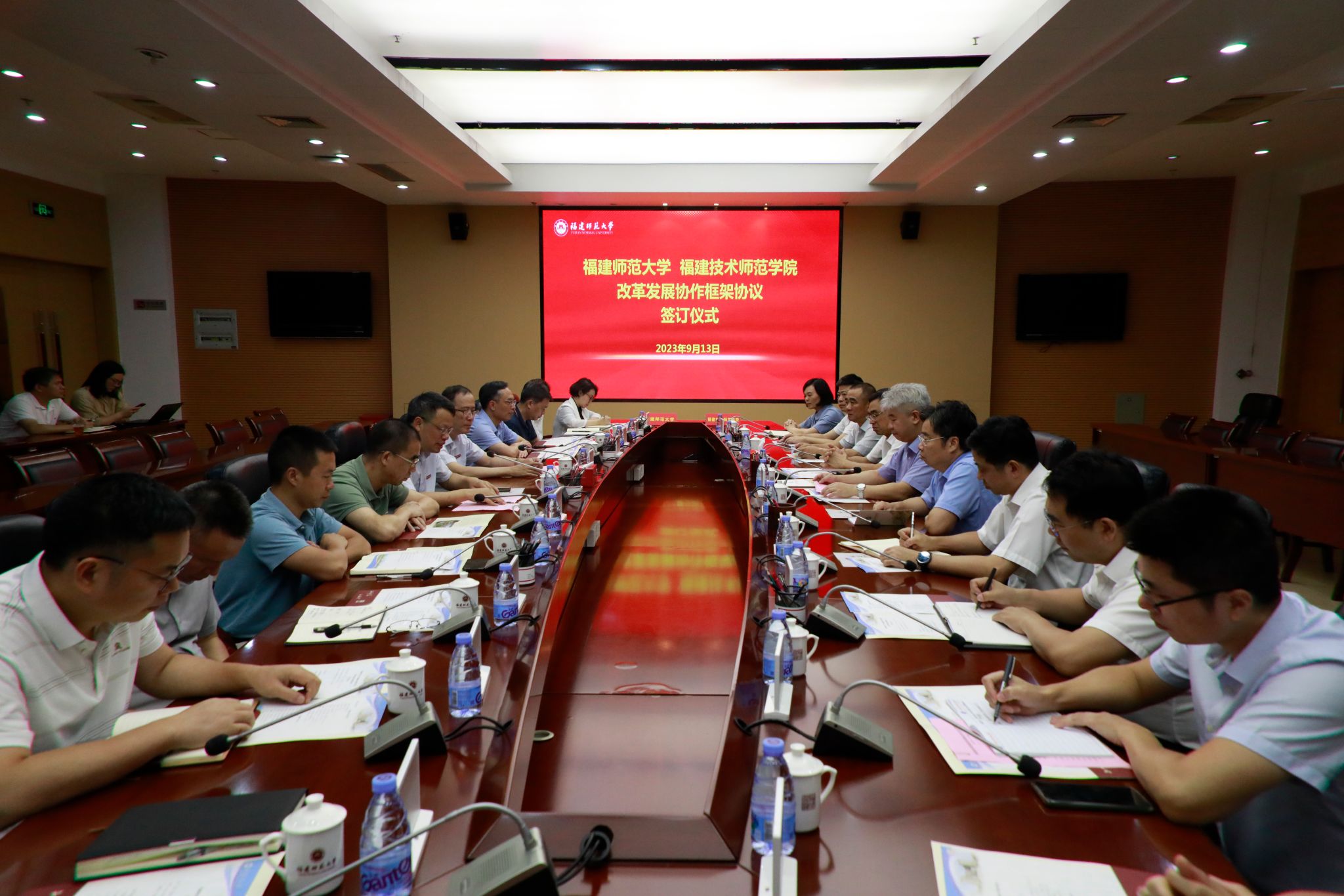 9月13日,福建师范大学、福建技术师范学院改革发展协作框架协议签订仪式在福建师范大学旗山校区举行。福建师范大学党委书记潘玉腾,我校党委书记赖海榕出席并致辞。福建师范大学校长王长平主持协议签订仪式。福建师范大学副校长郑家建,我校校长廖深基、副校长商光美出席会议,两校党政办公室、组织、人事、教务、规划、科研、财务等部门负责人参加会议。