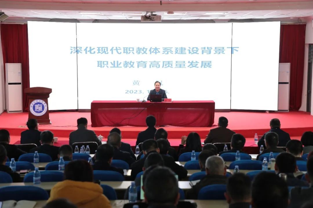 黄侃教授围绕当前我国职业教育发展的现状与思考、加快推进现代职业教育体系建设的改革与创新、国际化产教融合的探索与实践、职业教育高质量发展的对策与建议等四个方面,作了生动精彩的阐述,并针对学校具体实际,提出指导意见。他希望学校立足办学定位和区域优势,从加强整体规划、注重政策集成,紧贴当前需求、做强优势专业,深化教学改革、强化队伍建设,发挥行业示范、彰显引领作用,体现学校特色、扩大培训市场等五个方面着力,提升核心竞争力。