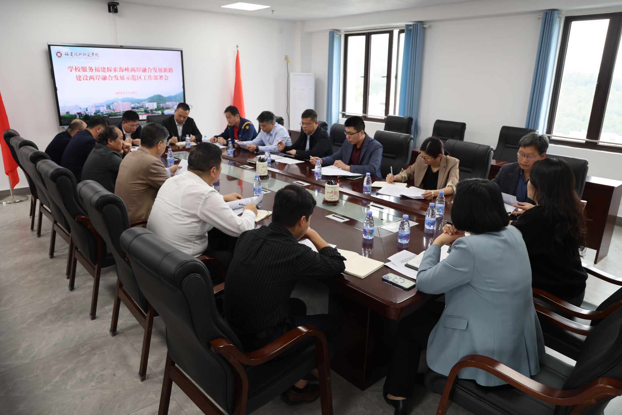 会上,发展规划处负责人对学校近日出台的《关于服务福建探索海峡两岸融合发展新路建设两岸融合发展示范区的若干举措》作了解读,并就具体工作任务分解作了说明。台港澳事务办公室负责人通报了学校目前对台工作开展情况,就今后工作思路作了交流。各二级学院党政负责人结合学院实际,对落实学校《举措》、服务福建建设两岸融合发展示范区提出工作思路,并表示将落实好学校的部署安排。