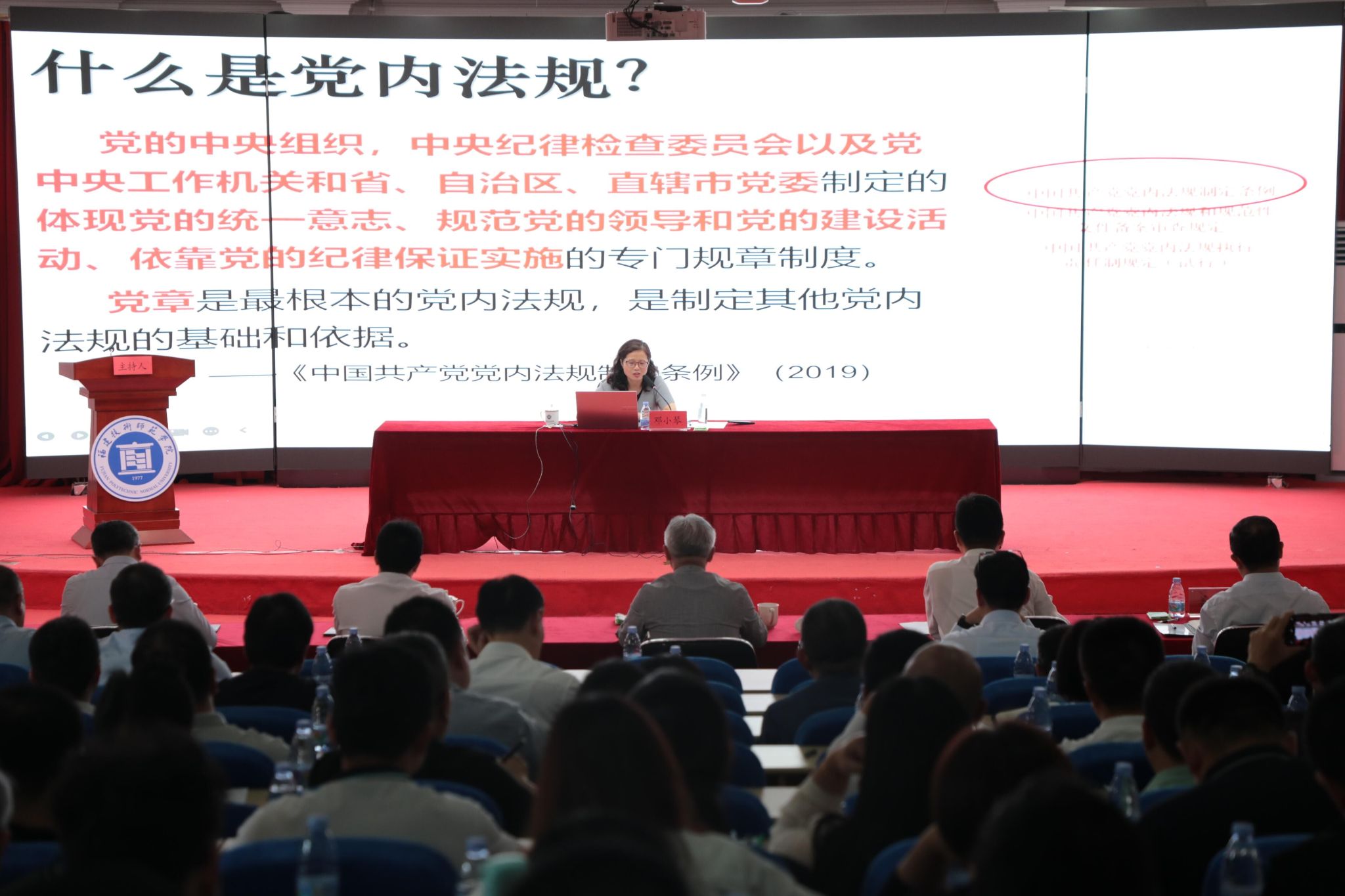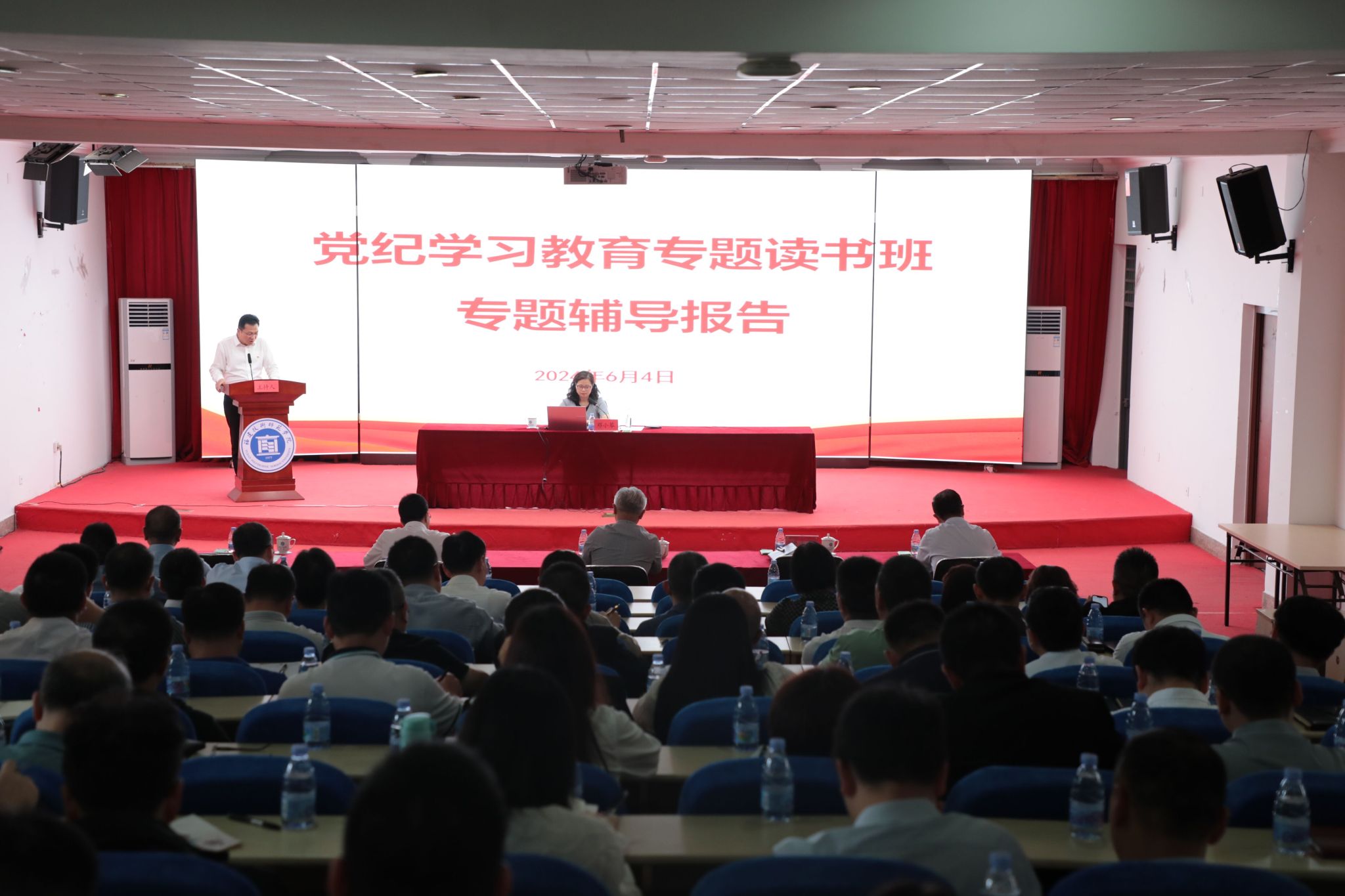 6月4日下午,学校党纪学习教育专题读书班在五马山校区科学楼金泰学术报告厅开展集中学习。福建省委党校党建教研部副教授邓小琴博士应邀作了题为《坚持以严的基调全面加强党的纪律建设》的专题辅导报告。报告会由校党委副书记林海峰主持,在校领导班子成员,副处级以上党员干部,第一期年轻教师能力提升专题培训班学员参加了学习。