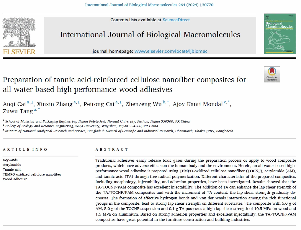 我校材料与包装工程学院2021级应用化学(师范)专业本科生蔡安琪、张欣欣、蔡佩容以共同第一作者身份撰写的论文“Preparation of tannic acid-reinforced cellulose nanofiber composites for all-water-based high-performance wood adhesives”在国际知名学术期刊《International Journal of Biological Macromolecules》(中科院1区TOP期刊,IF: 7.7)发表。该论文得到了福建省自然科学基金(2023J05212)以及国家级大学生创新创业训练计划(DC23004)的支持。共同通讯作者为我校材料与包装工程学院汤祖武博士、武夷学院吴振增副教授、孟加拉国科学和工业研究院的Ajoy Kanti Mondal教授。