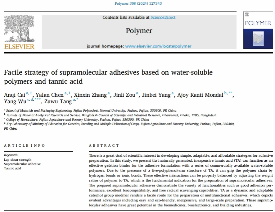 我校材料与包装工程学院2021级应用化学(师范)专业本科生蔡安琪、陈雅兰以共同第一作者身份撰写的论文“Facile strategy of supramolecular adhesives based on water-soluble polymers and tannic acid”在化学领域国际知名期刊《Polymer》(中科院2区,IF: 4.1)发表。该论文得到了福建省自然科学基金(2023J05212)以及国家级大学生创新创业训练计划(DC23004)的支持。我校材料与包装工程学院汤祖武博士、孟加拉国科学和工业研究院的Ajoy Kanti Mondal教授、福建农林大学吴扬博士作为共同通讯作者,团队成员还包括我校材料与包装工程学院杨金杯教授,2021级应用化学(师范)专业本科生张欣欣、邹金莉。