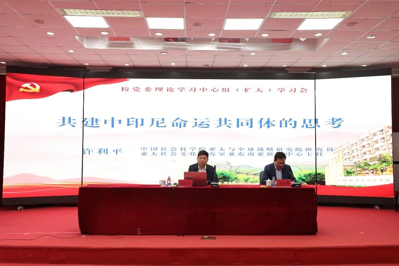11月22日上午,我校在五马山校区科学楼金泰学术报告厅召开校党委理论学习中心组(扩大)学习会。中国社会科学院亚太与全球战略研究院研究员许利平应邀莅校,作《共建中印尼命运共同体的思考》专题辅导报告。校党委副书记林海峰主持会议。福州新区元洪功能区管委会相关负责同志,校党委理论学习中心组成员,全校科级以上干部、印尼研究院相关研究人员等参加会议。