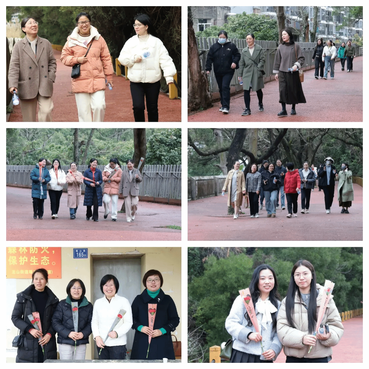 五马山栈道春意盎然,“春之舞——步履间她的声音”健康徒步活动在欢声笑语中拉开帷幕。女教职工们三五成群,沿山道健步而行。沿途设置的赠花驿站与摄影打卡点成为亮丽风景线。她们手持鲜红康乃馨,或驻足留影记录春日倩影,或结伴畅谈交流日常心得,矫健步伐与烂漫山花相映成趣,充分展现新时代女性昂扬向上的精神风貌。