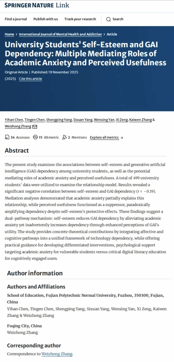近日,我校应用心理学专业本科生团队在国际知名SSCI期刊International Journal of Mental Health and Addiction(SSCI收录,JCR二区)上成功发表题为“University Students’ Self-Esteem and GAI Dependency: Multiple Mediating Roles of Academic Anxiety and Perceived Usefulness”的学术论文。该研究在青年教师张为忠(通讯作者)的指导下,由2024级应用心理学专业陈亦涵、陈庭恩(共同第一作者)及团队成员2024届应用心理学专业校友杨胜平,2024级应用心理学专业杨思轩、严雯星、曾曦、张凯雯等共同完成。