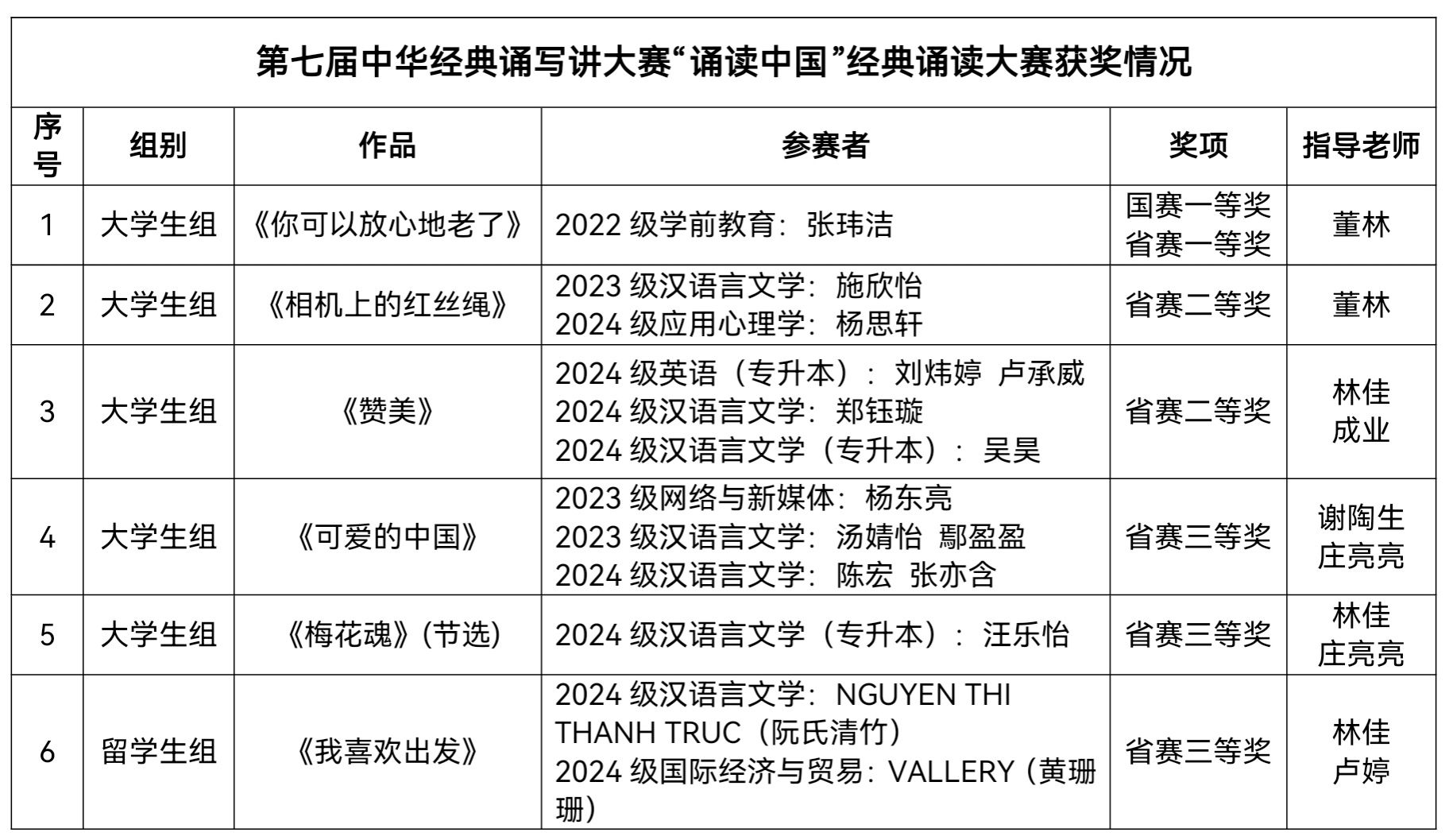 近日,教育部、福建省教育厅分别公布了第七届中华经典诵写讲大赛获奖名单。我校学子在全国及省级赛事中表现优异,荣获“诵读中国”经典诵读大赛国赛一等奖1项,省赛一等奖1项、二等奖2项、三等奖3项(含留学生组奖项1项),创下我校参与该赛事以来历史最好成绩。同时,学校荣获福建省第七届中华经典诵写讲大赛优秀组织单位。(教务处 文化与法律学院(海外教育学院) 校语委办)
