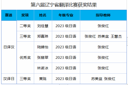 在第六届辽宁省翻译比赛中,6名学子荣获奖项,其中二等奖1人、三等奖2人、优秀奖3人。