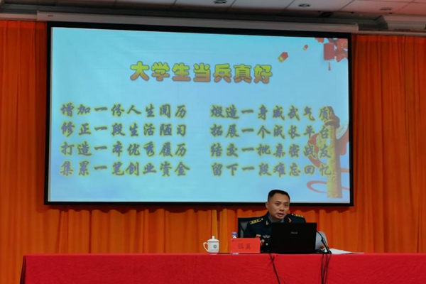 12月30日下午,我校在科学楼报告厅召开2021年征兵工作动员会,福清市人武部部长张翼应邀作征兵工作专题动员报告。福清市人武部、龙江街道武装部有关干部,校学生工作部(处)、教务处、安全保卫处负责人和征兵工作联络员、辅导员、学生代表等参加了会议。