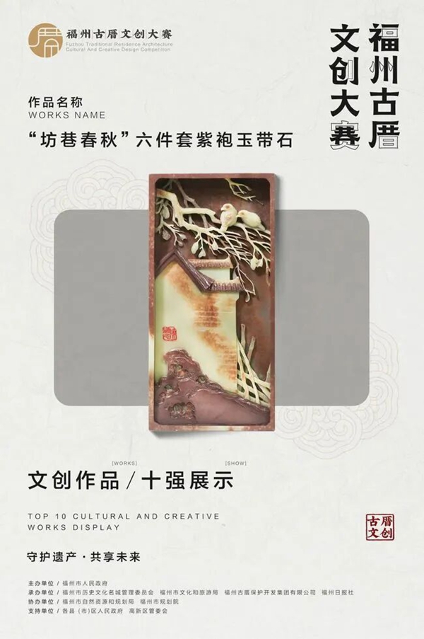 在福州市人民政府举办的首届福州古厝文创大赛中,陈礼忠大师工作室作品《“坊巷春秋”六件套紫袍玉带石》入围十强,喜获二等奖。