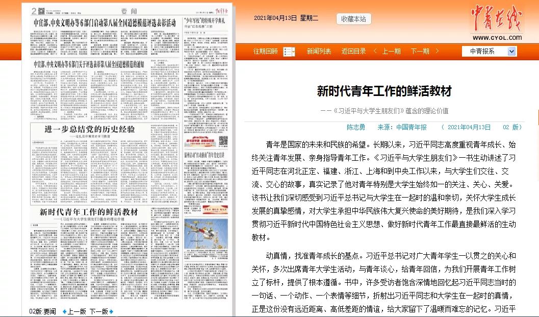 4月13日,我校副校长陈志勇教授署名理论文章《新时代青年工作的鲜活教材——<习近平与大学生朋友们>蕴含的理论价值》在《中国青年报》第2版刊发。(科研处)