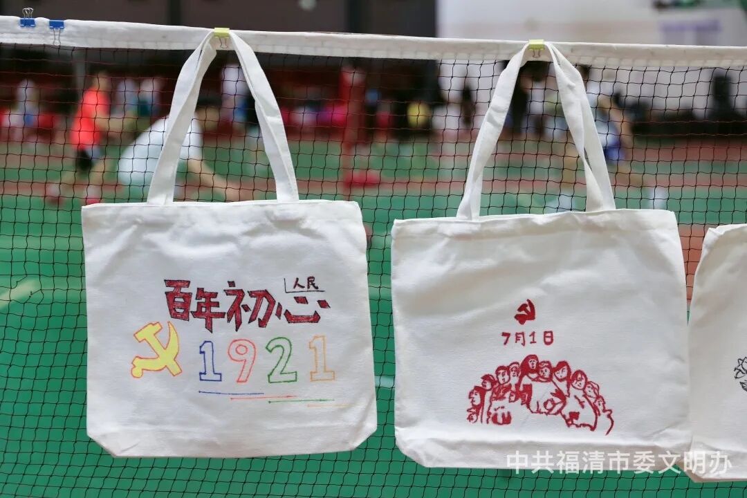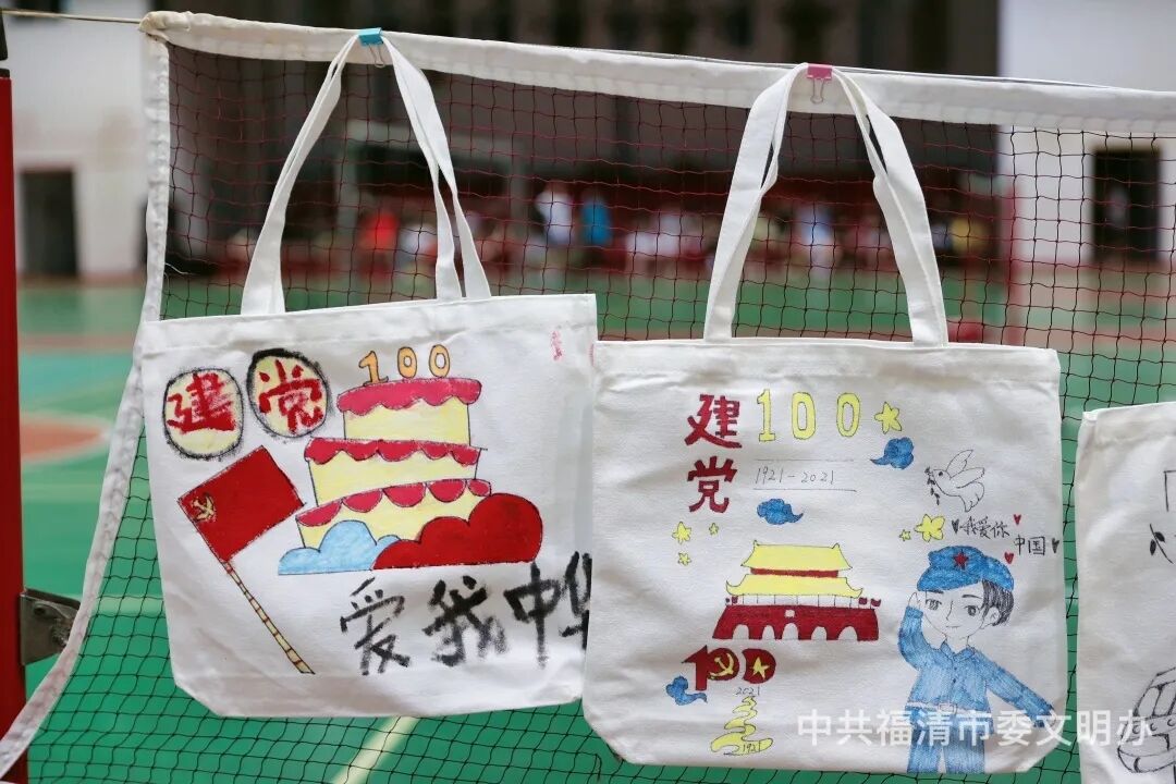结合庆祝中国共产党成立100周年的主题,同学们畅谈了传承红色基因、学习道德模范的感悟,并将自己的所思所想,利用布袋等材料进行绘画和书法创作,寓意“红色基因袋袋传承”。