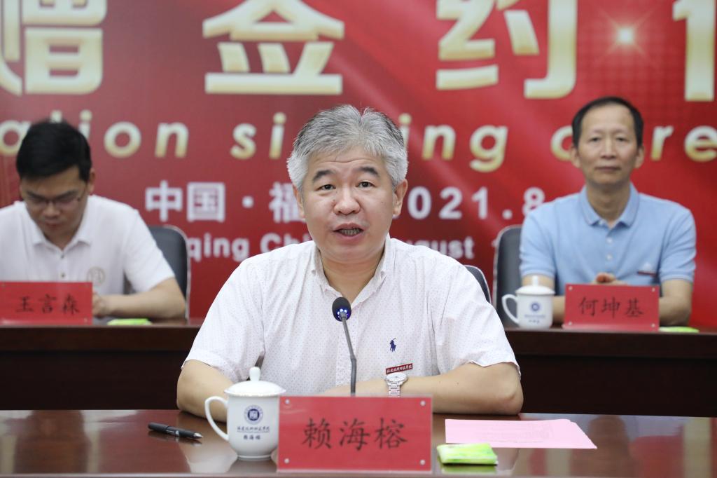 赖海榕书记作了讲话。他代表学校向林联兴博士慷慨解囊、捐资兴学、造福桑梓的仁心善举表示崇高的敬意,向为本次捐赠活动牵线搭桥、协调沟通、辛勤付出的魏飞秘书长、王朝盛副主席表示诚挚的谢意,向福清市委市政府和长期以来关心支持学校事业发展的各界人士表示衷心的感谢!