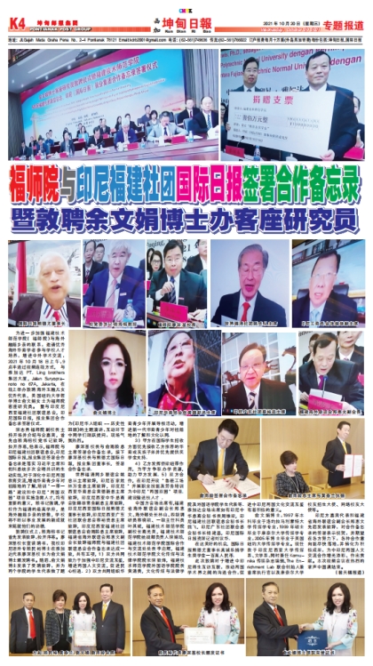13.《福师院与印尼福建社团国际日报签署合作备忘录暨敦聘俞文娟博士为客座研究员》,印尼《坤甸日报》专版