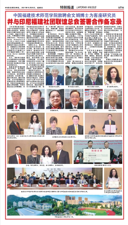 12.《中国福建技术师范学院敦聘俞文娟博士为客座研究员并与印尼福建社团联谊总会签署合作备忘录》,《印度尼西亚商报》专版报道