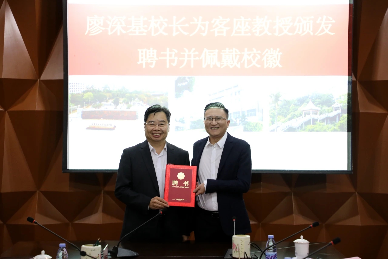 廖深基校长对杨勇金董事长加盟我校表示欢迎和祝贺。他表示,杨勇金董事长受邀担任我校客座教授,对于我校学科建设、科学研究具有积极意义。他希望杨董事长能充分发挥引领和示范作用,与学院共享科研成果,共促校企融合,共同提高人才培养质量。