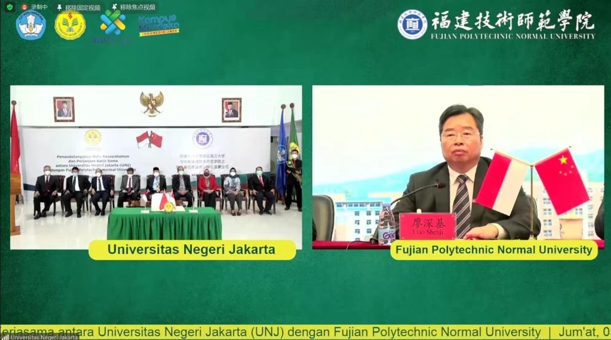 廖深基校长介绍了我校基本办学情况。他表示,福建技术师范学院坐落于中国著名侨乡、中国-印尼“两国双园”项目中方园区所在地——福建省福清市,与印尼高校开展教育合作是我校的光荣使命。他指出,印尼雅加达国立大学的学科布局与我校高度契合,两校之间具有紧密合作的坚实基础。两校签署协议备忘录将有助于推动双方在师生交流、人才培养、科学研究等方面的合作,促进两校师生共同成长和进步。他希望两校加强沟通联系,共同落实好协议内容,推动备忘录转化为积极成果,为促进中印尼两国合作交流作出贡献。