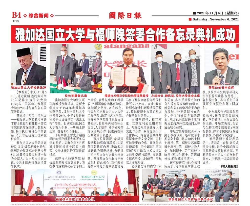 两校签约仪式得到了印尼最大且最具影响力的印尼语报纸《罗盘报》、印尼最大的新闻门户网站Detik、印尼最大的华文报纸《国际日报》以及壹福清等媒体的专题报道。(国际合作与交流处)