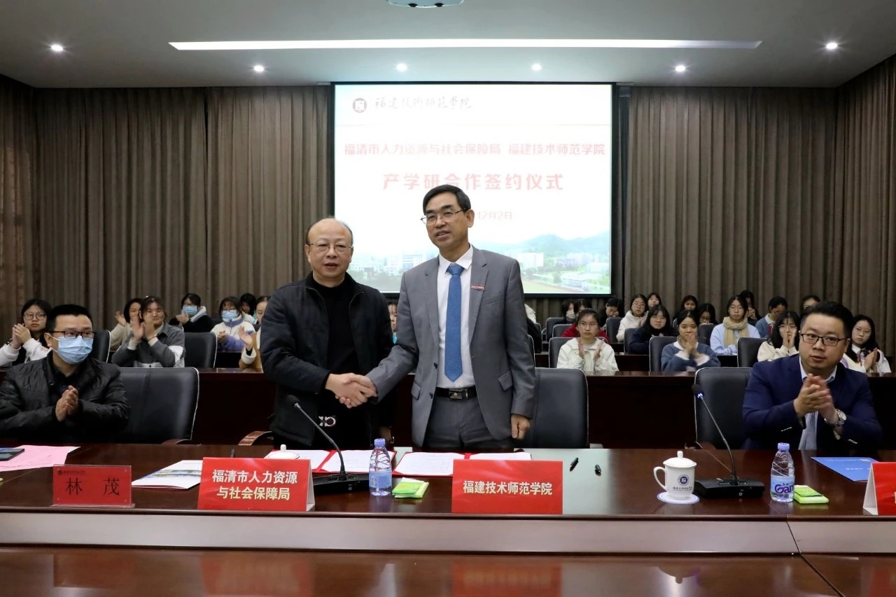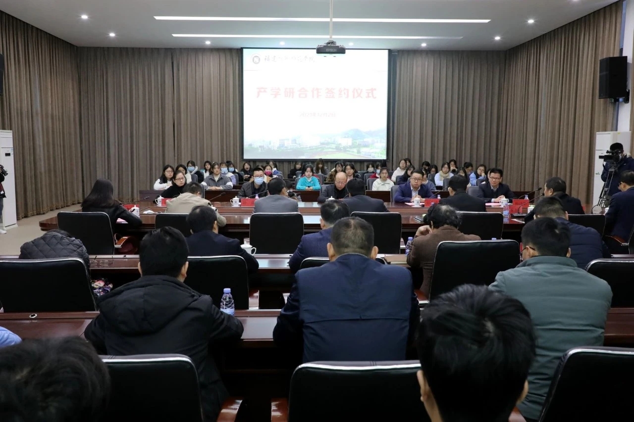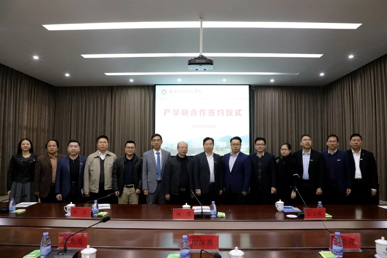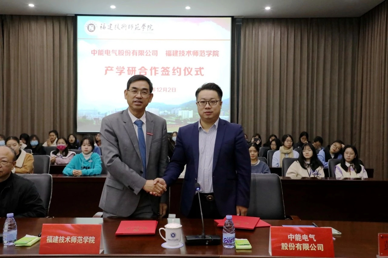 12月2日上午,我校在图书馆学术报告厅举行产学研合作签约仪式。校长廖深基,校党委委员、副校长商光美,福清市人力资源和社会保障局副局长林茂,福建中能电气股份有限公司总裁助理兼集团销售总经理彭全成,我校科研处处长,教育学院、电子与机械工程学院、大数据与人工智能学院和继续教育学院等党政主要负责人及师生代表参加签约仪式。