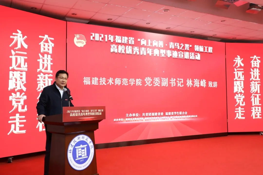 12月15日,由共青团福建省委、福建省学生联合会主办的2021年福建省“向上向善·青马之光”领航工程高校优秀青年典型事迹宣讲活动在我校举办。团省委副书记连占记,厦门市临家商务服务集团有限公司董事长、我校客座教授邱尚振,临家餐饮教育中心院长李娜,校党委副书记林海峰、副校长陈志勇,团省委学校部、福清市团市委负责人,以及我校改革与发展委员会成员、宣传部、学生工作部、教师工作部、校团委和各学院团委负责人,福州大学、福建师范大学、福建农林大学、闽江学院和我校的青年代表参加了活动。
