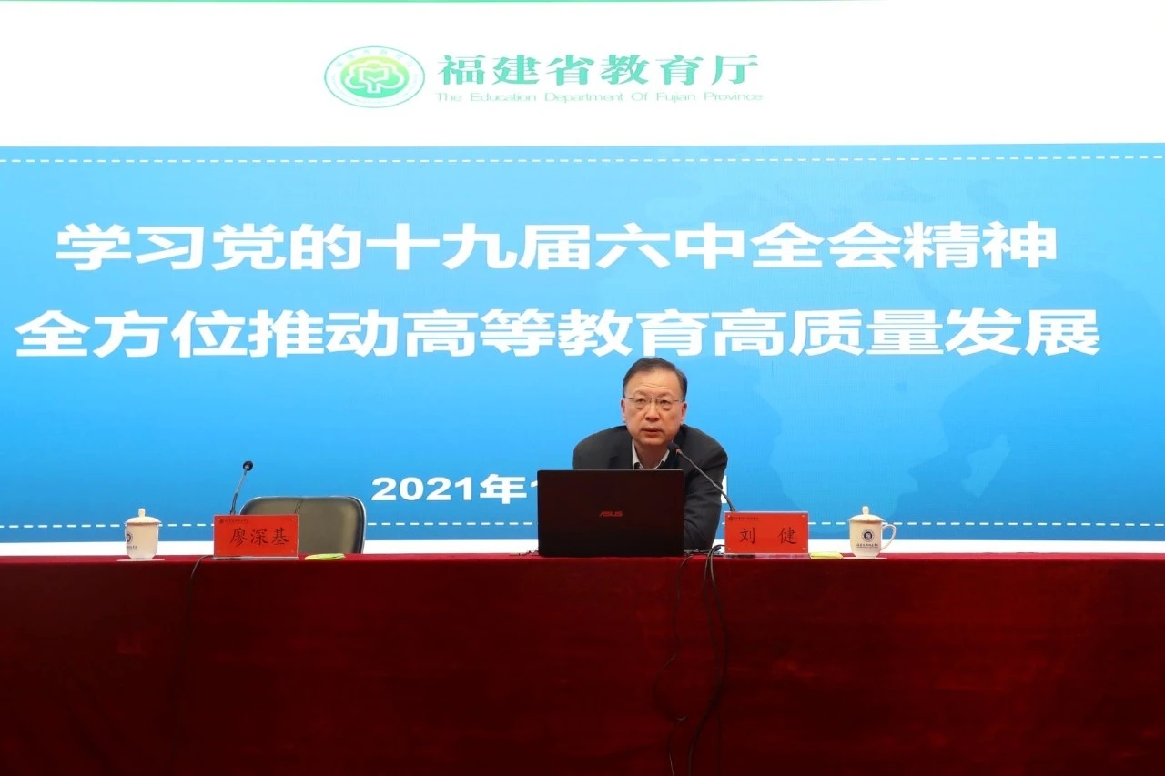 刘健副厅长以《学习党的十九届六中全会精神,全方位推动高等教育高质量发展》为题,从深入学习党的十九届六中全会精神和我省第十一次党代会精神、全面把握福建高等教育的新形势新任务,强化顶层设计整体谋划、全面构建高等教育发展新格局,以学科专业建设为核心、扎实推进学校事业的高质量发展等三个方面,作了精彩深刻的宣讲和辅导。