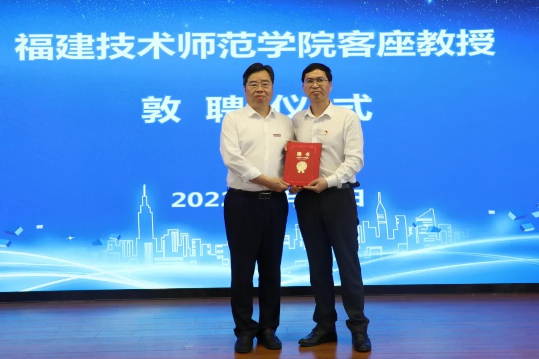 福建技术师范学院校长廖深基向福建理工学校校长江国奋颁发客座教授聘书。
