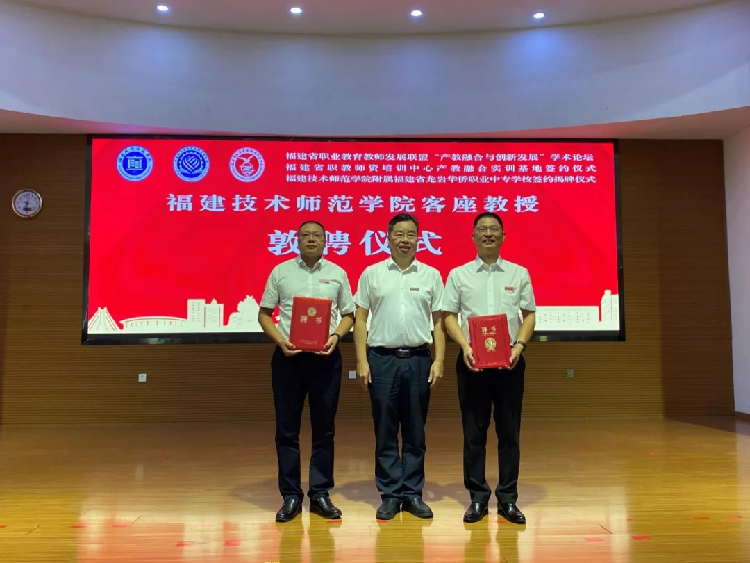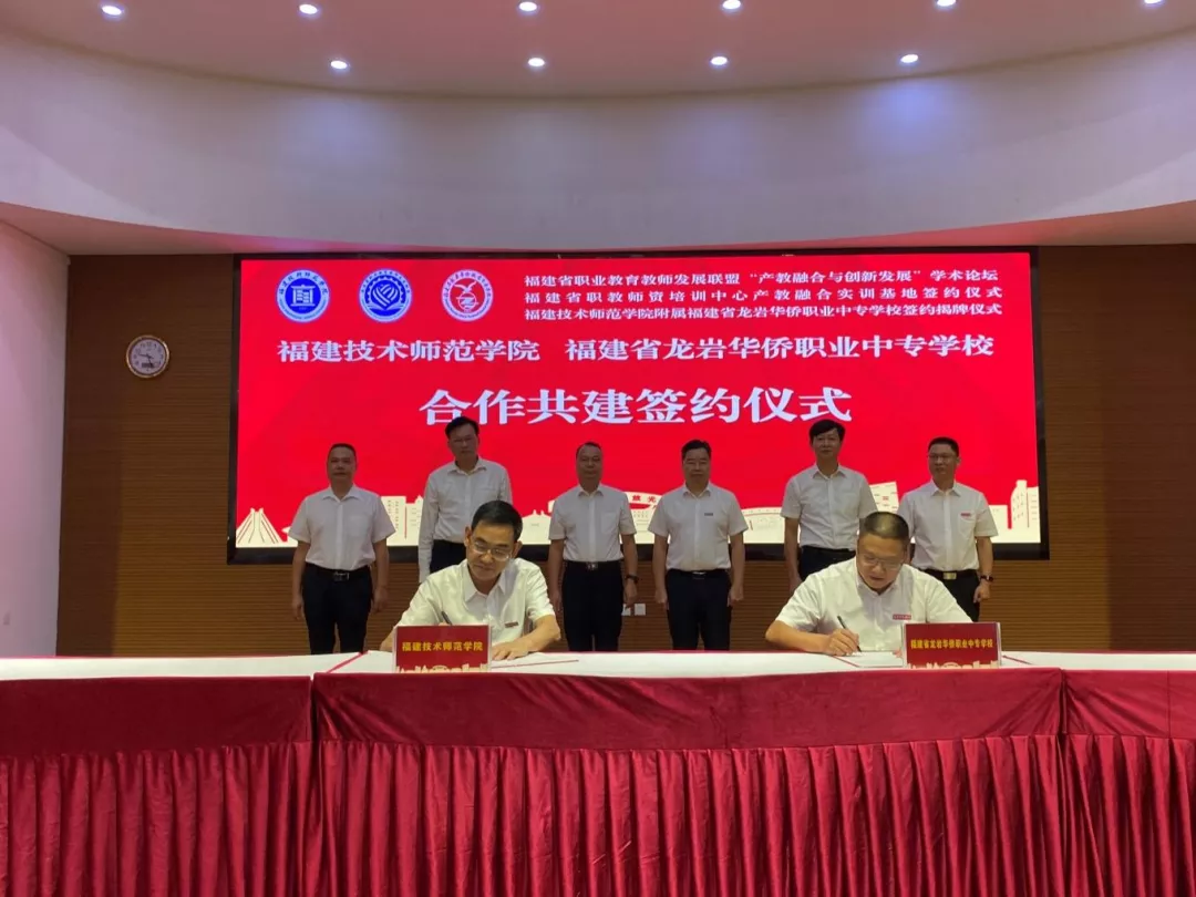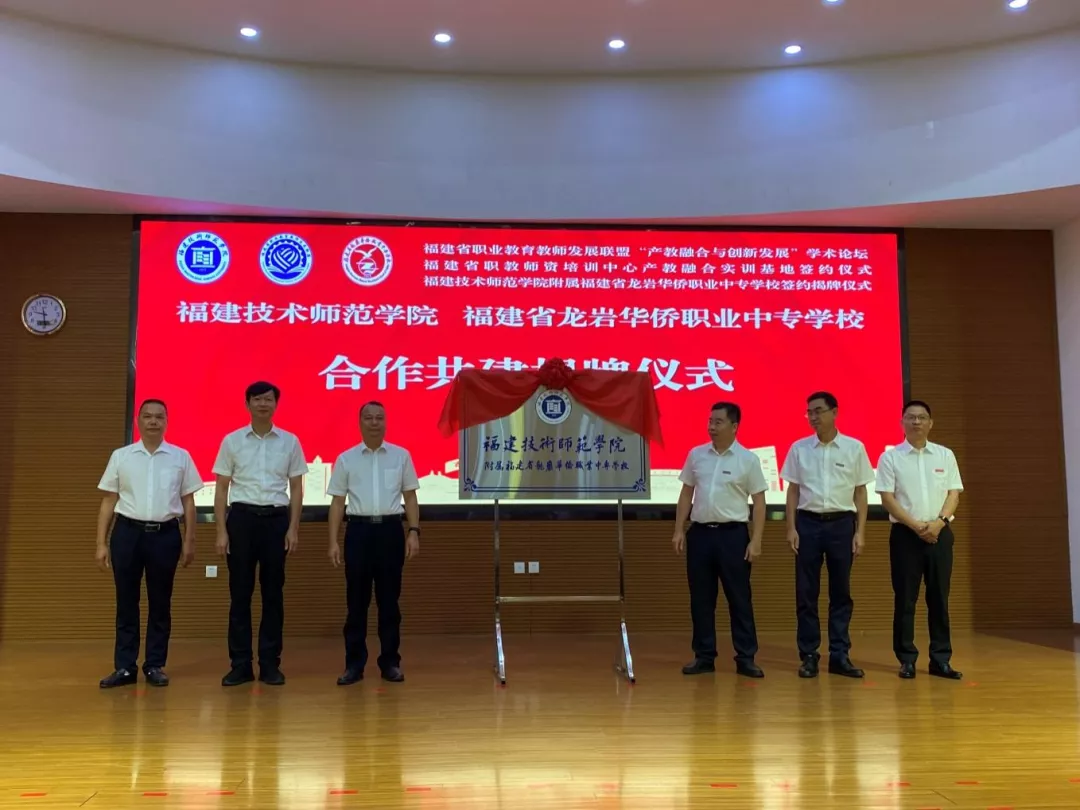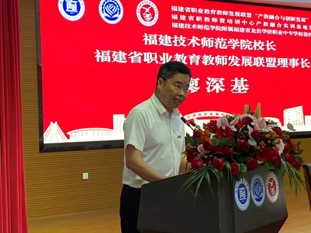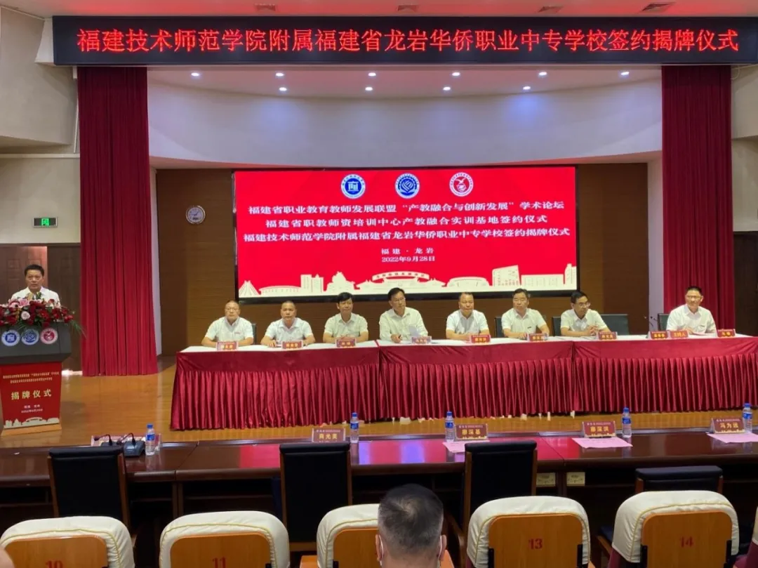 9月28日上午,福建省职业教育教师发展联盟“产教融合与创新发展”学术论坛暨福建技术师范学院附属福建省龙岩华侨职业中专学校揭牌仪式在福建省龙岩华侨职业中专学校举行。我校校长、福建省职业教育教师发展联盟理事长廖深基,副校长商光美,龙岩市人民政府党组成员、副市长廖深洪,新罗区人民政府副区长林峰,新罗区教育局党组书记、局长陈金堂,福建省龙岩华侨职业中专学校党委书记马锦等出席签约揭牌仪式,并共同为附属校揭牌。会议通过线上线下相结合的方式进行。广东省机械技师学院党委书记冯为远,福建省龙岩华侨职业中专学校校长赖永贵,省内外职业教育研究专家代表、省职业教育教师发展联盟会员单位代表、企业代表参加相关活动。龙岩市教育局党组成员、副局长温寿春主持揭牌仪式。