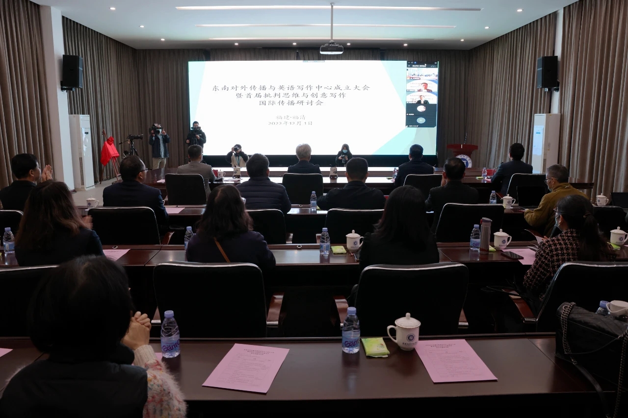 12月1日上午,由福建省政府新闻办指导的东南对外传播与英语写作中心成立大会暨首届批判思维与创意写作国际传播研讨会在我校五马山校区图书馆学术报告厅举行。大会以线上线下相结合的方式举行。中国外文局原常务副局长郭晓勇,中国国际公共关系协会副会长、学术委员会主任、国际关系学院原副校长郭惠民,中共中央党史和文献研究院研究员俞晓秋等专家学者通过线上方式参加会议。中共福建省委宣传部副部长、福建省政府新闻办主任叶雄彪,闽南师范大学副校长张龙海,我校党委书记赖海榕等到场出席。成立大会由校党委委员、副校长陈志勇主持。