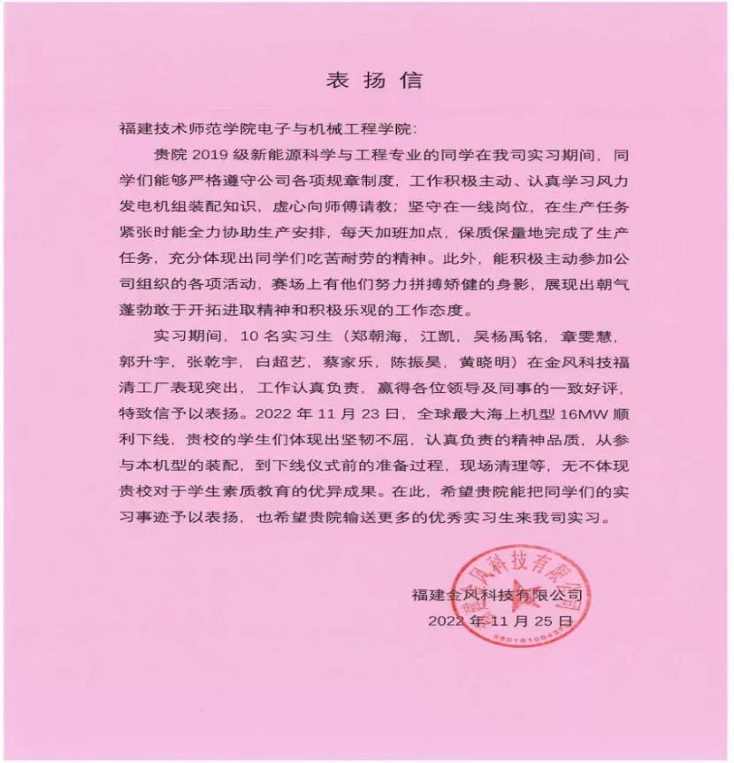 日前,我校电子与机械工程学院收到了一封来自福建金风科技有限公司发来的表扬信。信中,金风科技对我校电子与机械工程学院2019级新能源科学与工程专业的10名实习同学在实习期间的表现给予了高度评价,并进行表扬。