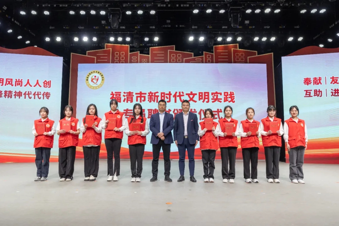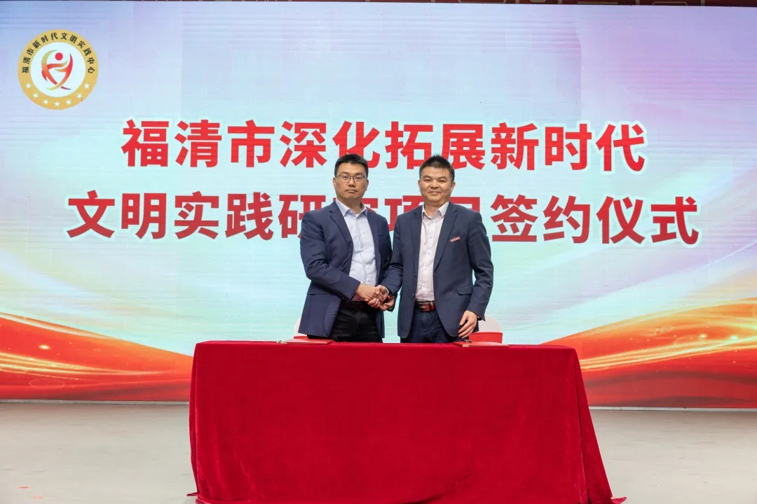 文化传媒与法律学院与福清市委文明办负责人签署共建福清市新时代文明实践中心项目合作协议。与会领导分别为福清市新时代文明实践专员、福清市第三届道德模范颁发证书,为福清市志愿服务总队“8+N”专业志愿服务支队授旗。我校首批10名同学受聘福清市新时代文明实践专员。