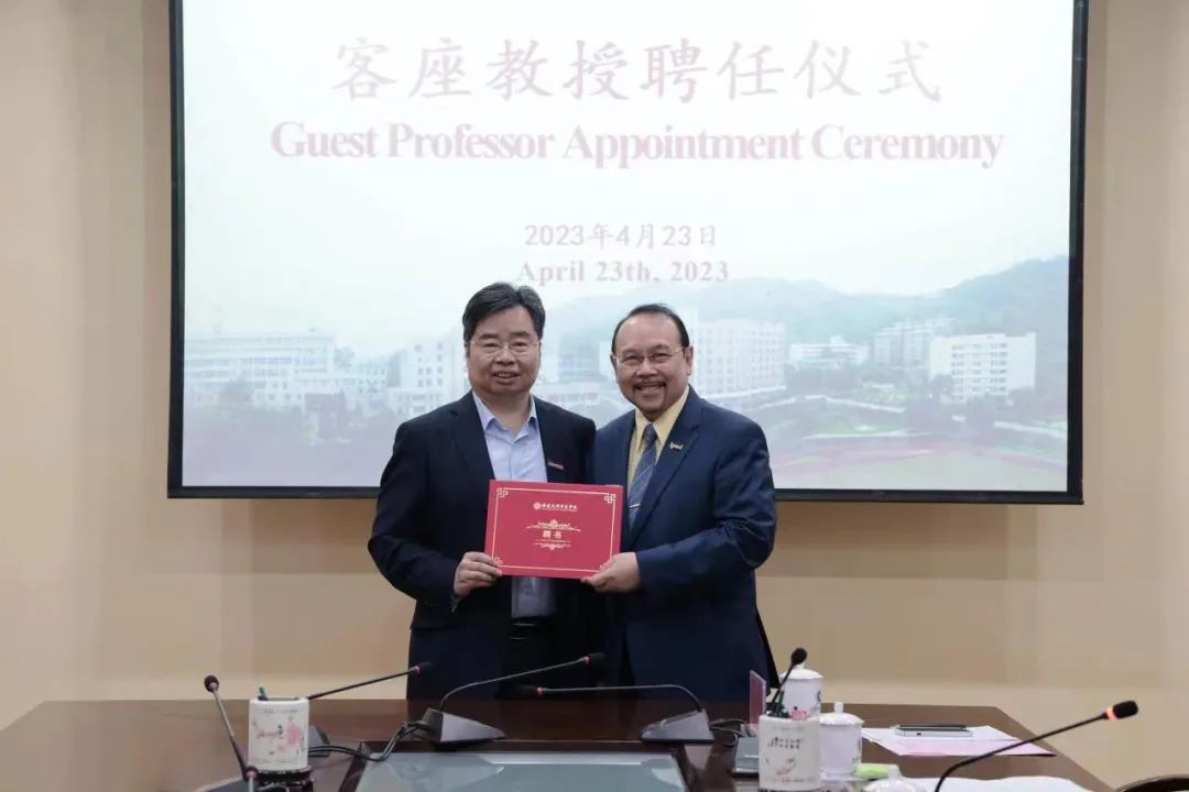 廖校长对阿曼教授受聘担任我校客座教授表示欢迎和感谢,并简要介绍了学校基本办学情况,回顾了两校签署合作框架协议以来开展的合作情况。他希望两校通过加深了解,加强交流,取得丰硕合作成果,为推进中印尼“两国双园”项目实施,共建中印尼命运共同体作出贡献。