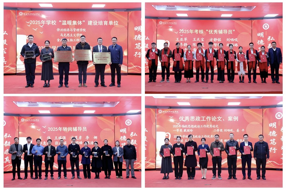 会议全面回顾了过去一年学生工作系统取得的成绩,向“温暖集体”建设培育单位、辅导员工作室培育项目授牌,为2025年转岗辅导员颁发纪念牌,对荣获省级以上荣誉的政工干部、年度考核优秀的辅导员以及校级思想政治工作论文与案例获奖者予以表彰。
