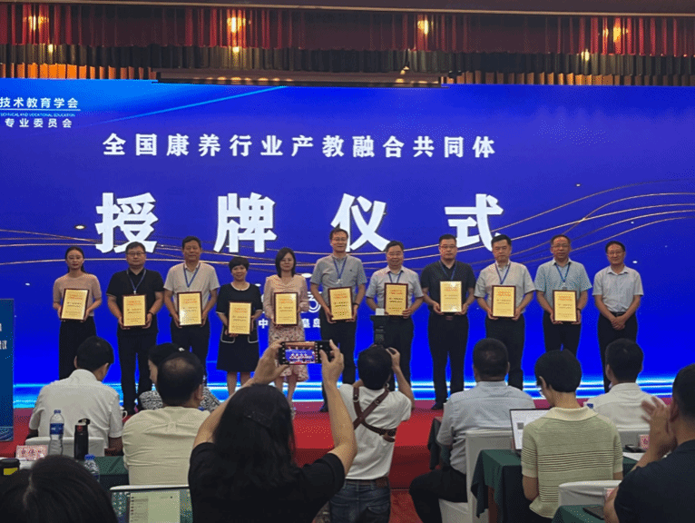 会议表决通过了《全国康养行业产教融合共同体章程》,选举产生了第一届理事长单位、副理事长单位、常务理事单位、秘书处单位等,讨论通过了《全国康养行业产教融合共同体建设方案》。在全国康养行业产教融合共同体揭牌和向理事长单位、副理事长单位、常务理事单位及理事单位代表授牌仪式上,廖深基校长代表学校上台领取副理事长单位牌匾。