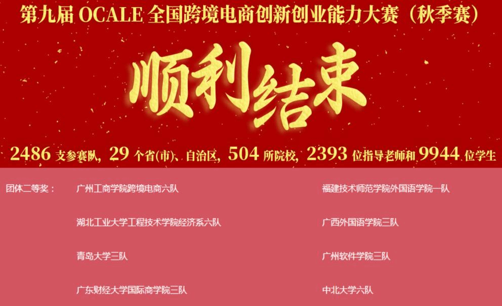 近日,由中国国际贸易学会举办的第九届OCALE全国跨境电商创新创业能力大赛(秋季赛)圆满落幕。我校外国语学院2支学生团队首次参赛,并荣获本科组团体二等奖。