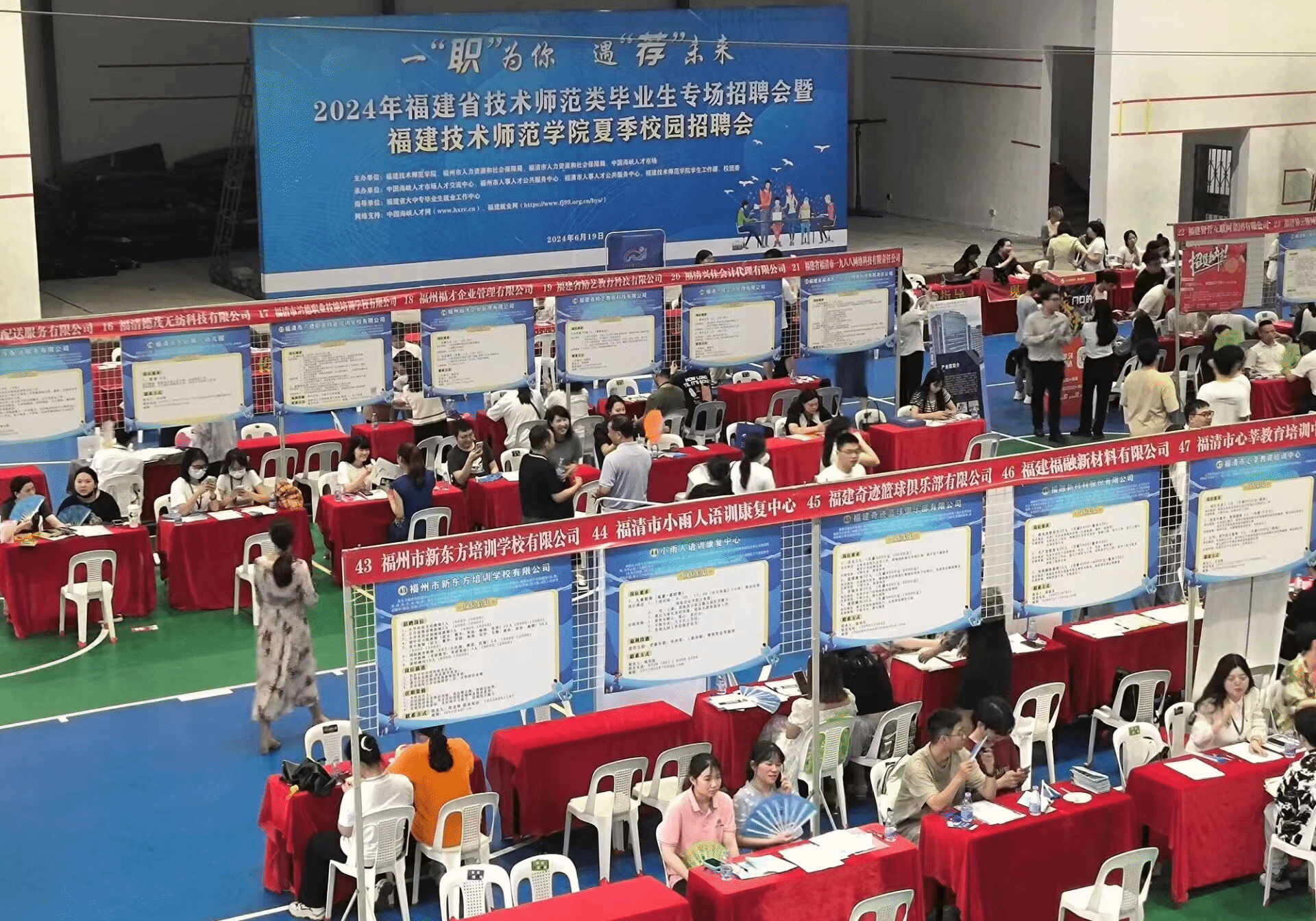 为抢抓毕业生就业关键期,全力促进毕业生充分就业,6月19日下午,我校联合福清市人力资源和社会保障局、中国海峡人才市场在五马山校区球类馆举办“一‘职’为你 遇‘荐’未来——2024年夏季校园招聘会”暨福清市“书记市长送岗留才进校园”活动。校党委副书记林海峰,福清市副市长林鹤志出席指导。福清市人力资源和社会保障局党组书记、局长王继强,副局长陈梦婧、福清市人事人才公共服务中心负责人及我校学生工作部、校团委、武装部等部门和各二级学院党政负责人、毕业班辅导员及全体未落实毕业去向的2024届毕业生参加活动。