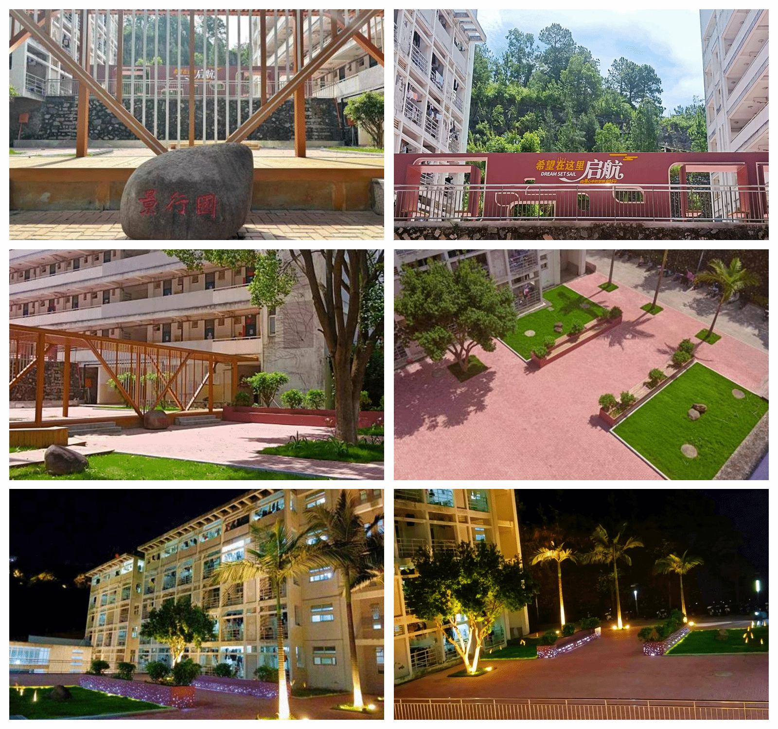 为增加学生课余时间的学习、交流和活动空间,按照“应建尽建、集约共享”原则,结合师生实际需要,后勤管理处将石竹山校区学生公寓39-42号楼之间的空地打造成学生活动空间。学生活动空间将连廊与公寓楼群连成一体,缩短楼宇之间的距离感,通过增植绿化景观、绿地沿路和座椅附近新增氛围灯光等方式,打造更加自然静谧的夜景,使学生身临其境时候可以更加休闲和放松。同时,设置一些个性、潮流、兼具艺术性和实用性的钢构装饰,为校园布局增加活力感,既可作为学生活动空间,亦可作为学生休闲聊天的场所。