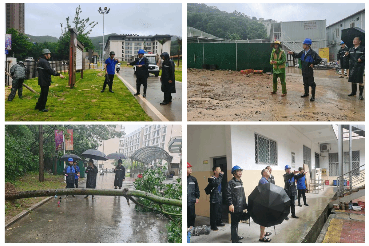 商光美副校长一行深入两校区学生宿舍、教工居住区、教学实训室、地下空间、在建工地、校园门岗、山体边坡、周边围墙等重点区域和重点部位,围绕高空悬挂物、行道树、塔吊、工棚等防风加固以及渠道水域、排水管道、地下电房泵房、低洼易涝点等防浸排水等,进行隐患排查整治,并提出防御台风和抢险救灾部署要求。
