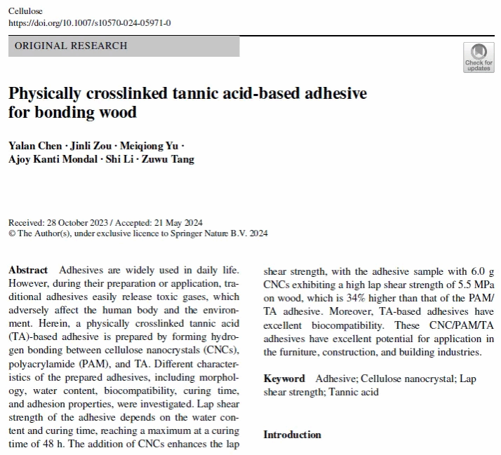 我校材料与包装工程学院2021级应用化学(师范)专业本科生陈雅兰以第一作者身份撰写的论文“Physically crosslinked tannic acid-based adhesive for bonding wood”在材料科学领域国际学术期刊《Cellulose》(中科院2区,IF: 4.9)发表。该论文得到了福建省自然科学基金(2023J05212)以及国家级大学生创新创业训练计划(DC23004)的支持。我校材料与包装工程学院汤祖武博士、安徽工程大学李诗博士、孟加拉国科学和工业研究院的Ajoy Kanti Mondal教授作为共同通讯作者,团队成员还包括我校材料与包装工程学院余美琼副教授,2021级应用化学(师范)专业本科生邹金莉等。