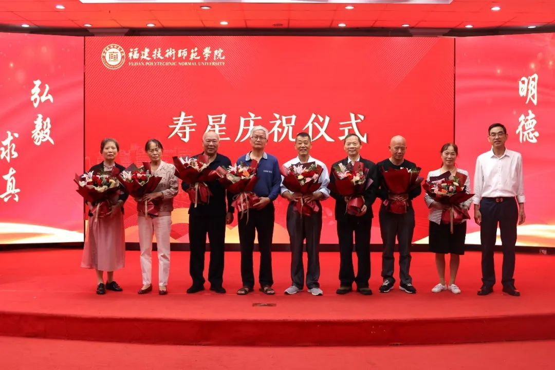 在活动仪式上,商光美副校长为3对金婚夫妇代表和70周岁、80周岁的13位寿星代表送上鲜花和祝福,与代表们亲切交谈并合影留念。钻石婚金婚代表陈文泉、寿星代表赖烺秋先后发言。