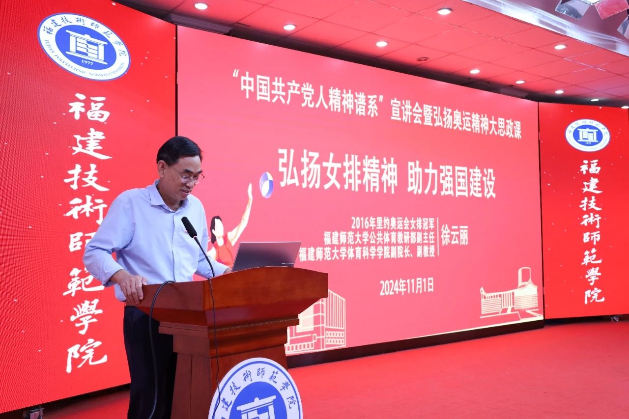 11月1日下午,我校在五马山校区科学楼报告厅举行“传承红色基因、学思践悟中国共产党人精神谱系”宣讲会暨弘扬奥运精神大思政课。全国高校“中国共产党人精神谱系”宣讲团专家、2016年里约奥运会女排冠军、福建师范大学公共体育教研部副主任(主持工作)、体育科学学院副院长徐云丽应邀来校宣讲。宣讲会由校党委委员、副校长商光美主持。