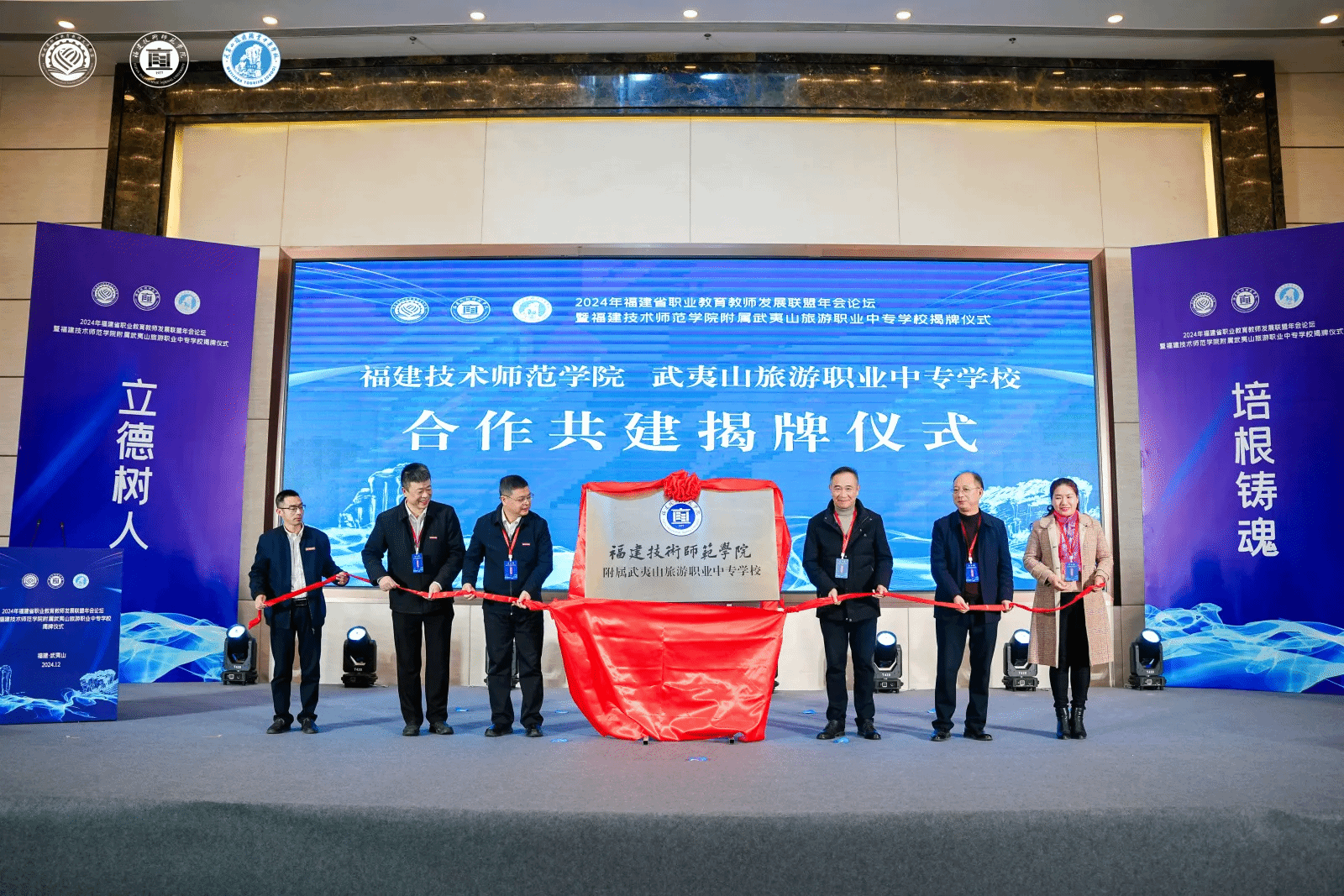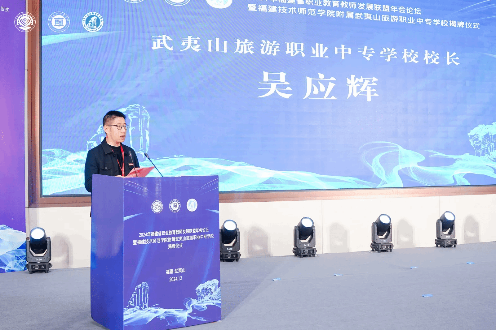 12月30日,2024年福建省职业教育教师发展联盟年会论坛暨福建技术师范学院附属武夷山旅游职业中专学校揭牌活动在武夷山市举行。副校长姜兴山,南平市教育局副局长黄小青,武夷山市政协副主席、教育局党组书记、局长兰智权,武夷山旅游职业中专学校党总支书记林谋清及校长吴应辉等领导出席活动。省内外职业教育研究专家代表、福建省职业教育教师发展联盟会员单位代表、我校附属校基地校代表、职业院校代表、企业嘉宾等参加了有关活动。