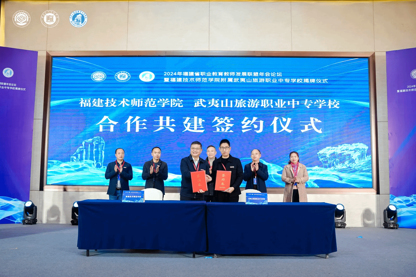 在签约仪式上,姜兴山与吴应辉在与会嘉宾的见证下签订了合作共建协议。随后,与会嘉宾共同为福建技术师范学院附属武夷山旅游职业中专学校揭牌。