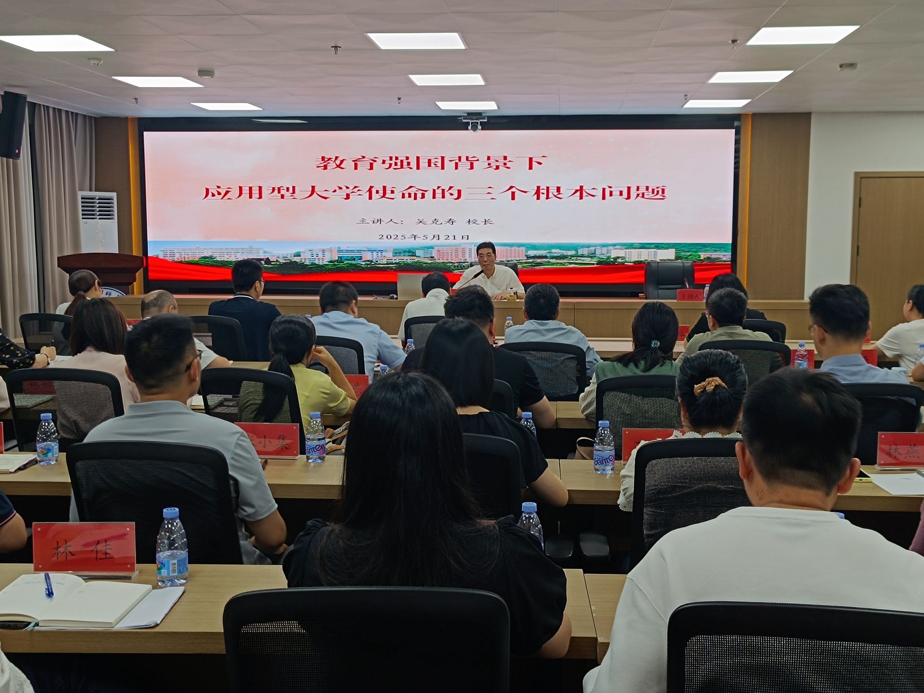 5月21日晚,学校第二期年轻教师能力提升专题培训班在联兴楼集贤厅开展集中培训。校党委副书记、校长吴克寿作了题为《教育强国建设背景下应用型大学使命的三个根本问题》的辅导报告。近期新提拔的12位处级干部、15位跟岗干部和第二期年轻教师能力提升专题培训班学员参加了学习。