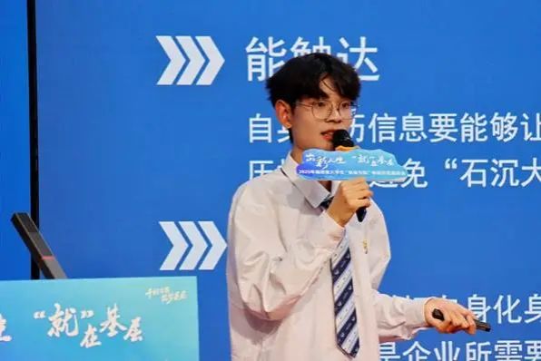 胡兆进以《向下扎根,向上生长——给自己一个不设限的未来》为题,通过就业形势、成长故事和就业感悟三个方面,展现自己从一线员工到区域管理者的蜕变之路,鼓励大学生先就业后择业,树立“三百六十行,行行出状元”的正确就业观,在不同领域里书写新时代青年的责任担当。