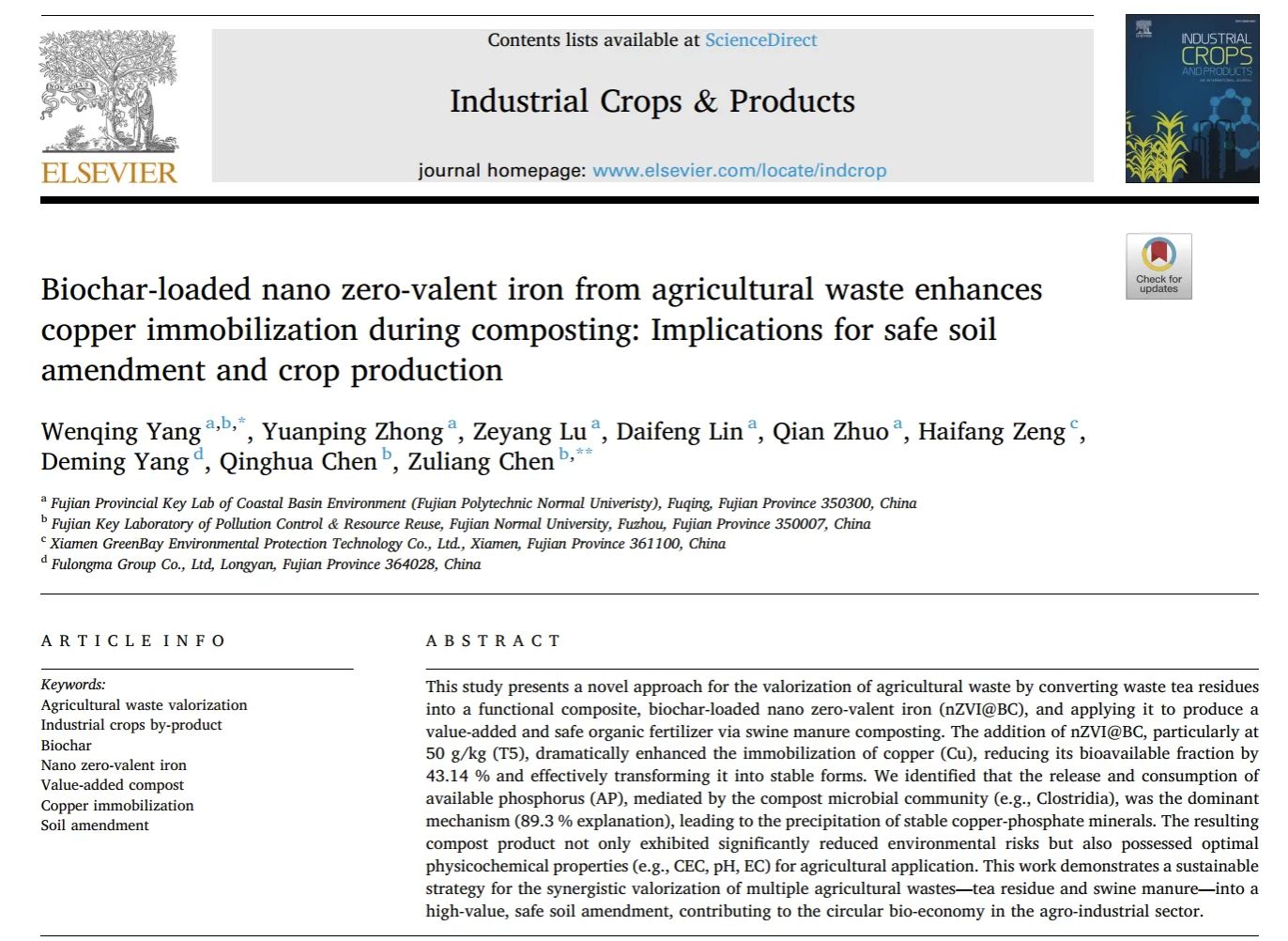 近日,我校海洋学院杨文卿博士团队在农业废弃物资源化利用领域取得重要进展,研究成果以“Biochar-loaded nano zero-valent iron from agricultural waste enhances copper immobilization during composting: Implications for safe soil amendment and crop production”(全文链接:https://doi.org/10.1016/j.indcrop.2025.122036 )为题,发表于农林科学领域国际权威期刊Industrial Crops and Products。该期刊位列中国科学院Ⅰ区TOP期刊,具有广泛的学术影响力。