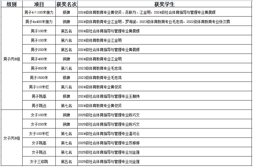 我校15名学子在历时3天的激烈角逐中,获得3银3铜的优异成绩,并荣获丙B组团体总分二等奖。其中,陈巧文在女子丙B组200米预赛中以27.14秒打破了学校39年的纪录,并在决赛中以27.05秒再次刷新学校纪录;江金明在男丙B组400米以50.10秒打破学校纪录、黄晨辉在200米决赛中以22.47秒打破学校纪录,均获第三名。(体育学院)