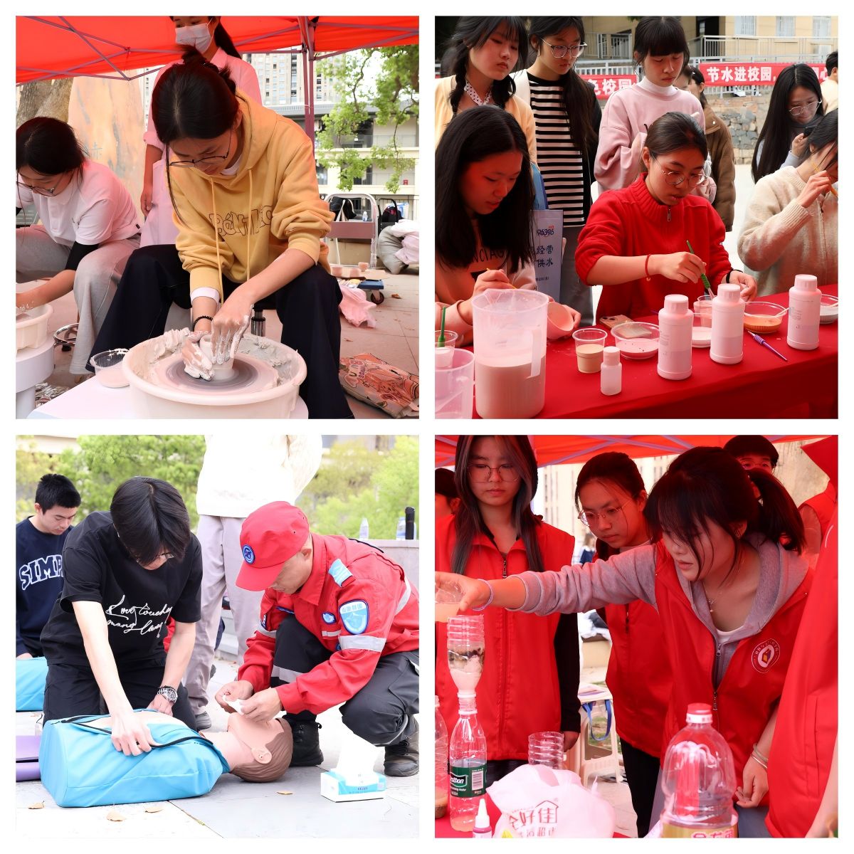 活动现场,与会嘉宾共同观看节水宣传视频,直观感受水资源的宝贵和节水的意义。材料与包装工程学院学生带来诗朗诵《我是一滴水》,以声音形式展现了水文化的独特魅力。活动设置水质检测体验区、科普宣教区、互动游戏区三大板块,形成了校园里一道亮眼的“节水风景线”。现场还开展了防溺水应急演练和AED实操培训,围绕远离危险水域、智慧救援、意外落水自救等关键要点向师生传递防溺水知识与技能。
