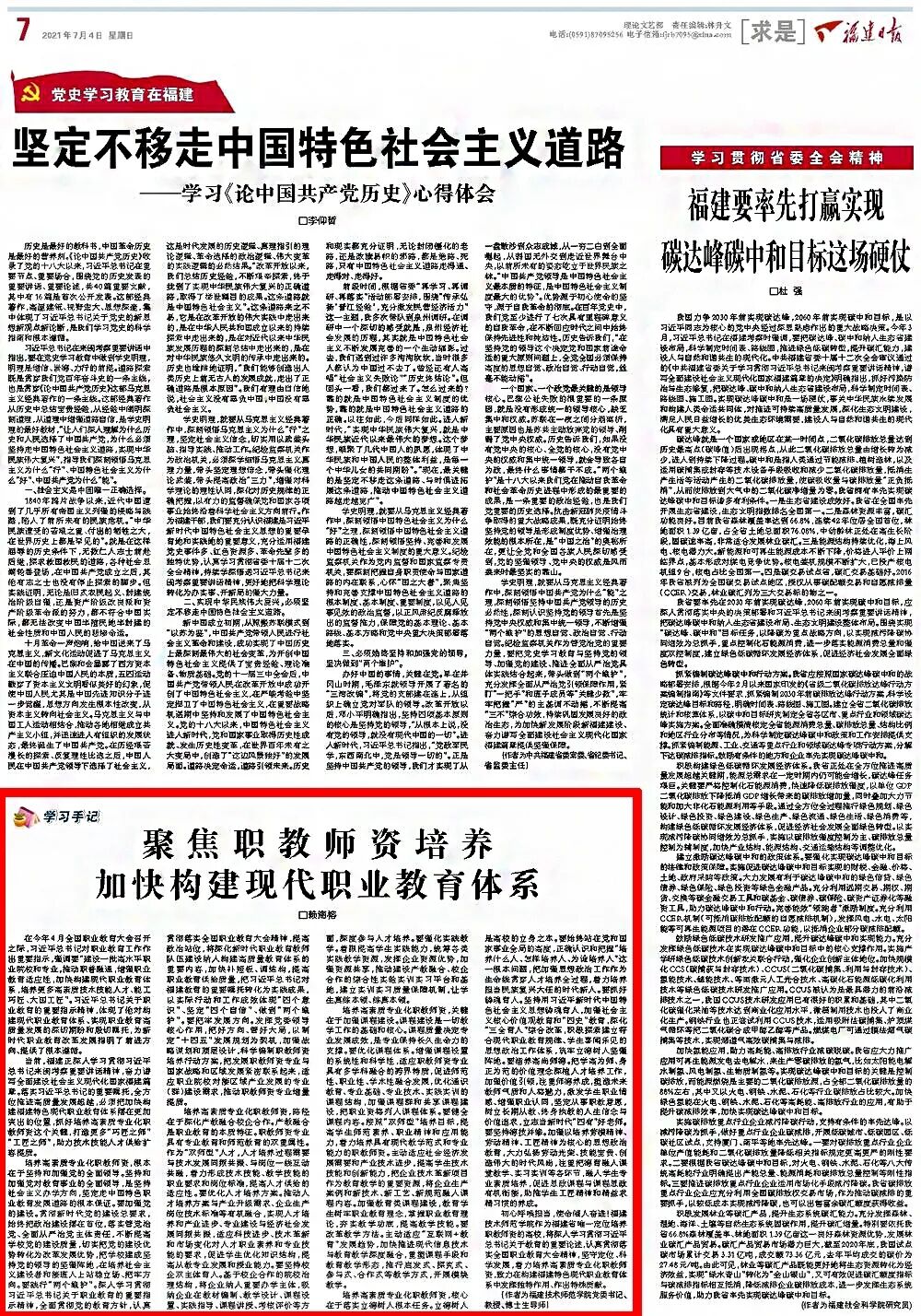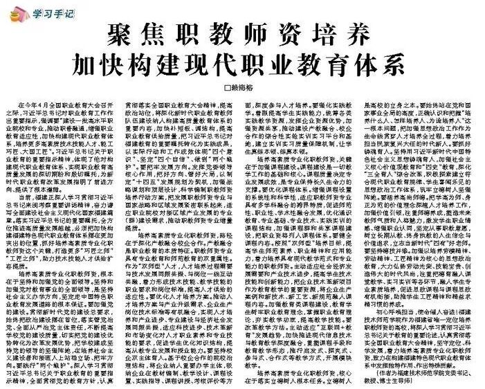 7月4日,《福建日报》求是版刊发了校党委书记赖海榕教授的署名文章《聚焦职教师资培养 加快构建现代职业教育体系》。