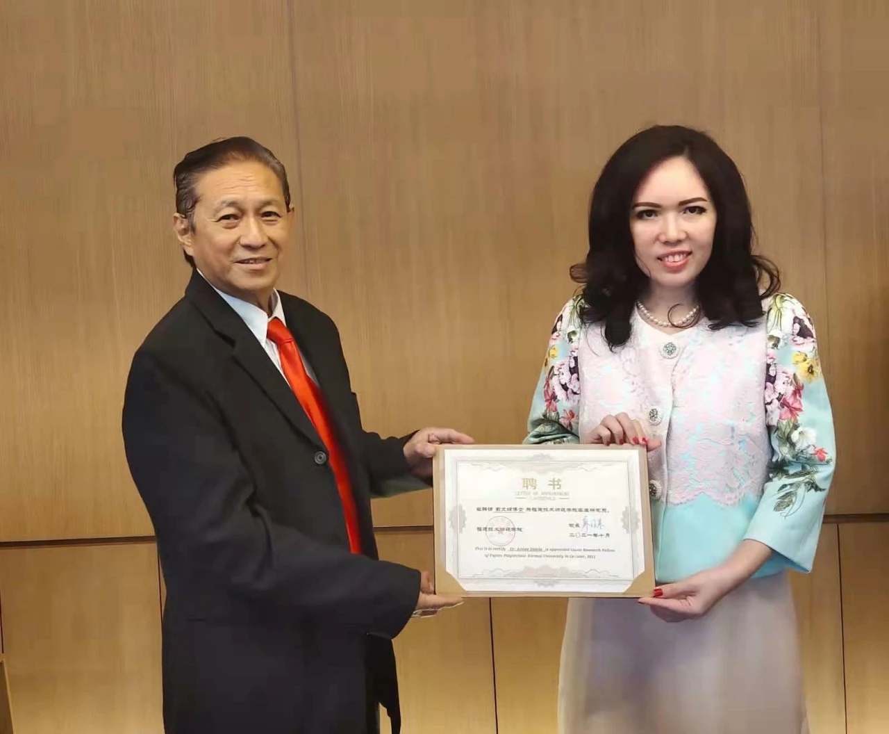 我校印尼语外专赖民裕博士在雅加达代表廖深基校长为俞文娟博士颁发聘书。